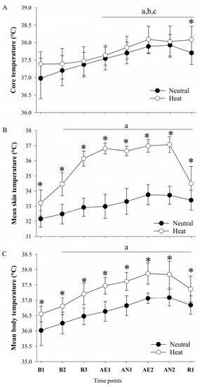 (A) Core temperature (B) mean skin temperature, and (C) mean body temperature response in thermoneutral and heat conditions. B1, baseline; B2, second baseline; B3, third baseline, AE1, first walking; AN1, first lifting; AE2; second walking; AN2, second lifting; R1, recovery. Values are mean ± standard deviation (n = 10). a p ≤ 0.05 versus B1; b p ≤ 0.05 versus B2; c p ≤ 0.05 versus B3; * p ≤ 0.05 versus heat condition.