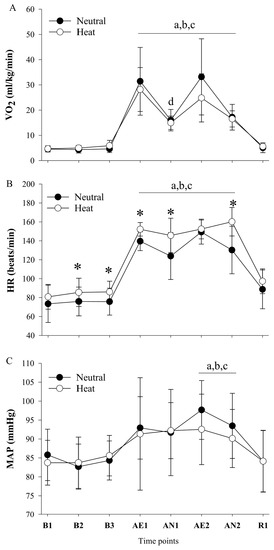 As shown in Figure 3A, VO2 indicated a significant interaction (F(7,63) = 5.526, p ≤ 0.001, = 0.38), but no main effect for condition (F(1,9) = 1.846, p = 0.207, = 0.17) and main effect for time (F(7,63) = 50.424, p ≤ 0.001, = 0.849), indicating that VO2 was significantly increased during exercise bouts (AE1 through AN2) compared to B1 through B3 (all p ≤ 0.05) in both conditions. Interestingly, VO2 was significantly decreased during AN1 compared to AE1 (p = 0.021). However, there was no significant difference between AE2 and AN2 (p = 0.110). As shown in Figure 3B, HR indicated a significant interaction (F(7,63) = 10.904, p ≤ 0.001, = 0.548), main effect for condition (F(1,9) = 21.651, p = 0.01, = 0.706), and time (F(7,63) = 140.847, p ≤ 0.001, = 0.940). HR was significantly increased during exercise bouts (AE1 through AN2) compared to B1 through B3 (all p ≤ 0.05). The HR was significantly higher at all-time points in the heat compared to the neutral condition with the exception of B1, AE2, and R1 (all p ≤ 0.05). As shown in Figure 3C, MAP indicated no significant interaction (F(7,56) = 1.119, p = 0.364, = 0.123) and no main effect of condition (F(1,8) = 0.092, p = 0.769, = 0.011), but main effect for time (F(7,56) = 28.604, p ≤ 0.001, = 0.781), indicating that MAP was significantly increased during AE2 and AN2 (all p < 0.05) compared to B1, B2, and B3.
