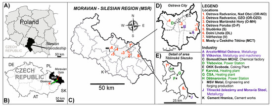 (A) Border between Czech Republic and Poland; (B) Localization of the Moravian-Silesian Region and Olomouc in the Czech Republic; (C) Detail of the Moravian-Silesian Region and localization of the sampling sites; The main pollution sources in Ostrava City (D) and in the area of Těšínské Slezsko (E).