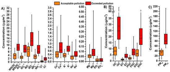 Boxplot in the period of acceptable and exceeded pollution for concentrations of water-soluble ions in PM10 (A); concentrations of carbon forms in PM10 (B) and for concentrations of PM10 (C). Explanations: Water soluble organic carbon (WSOC), secondary organic carbon (SOC), particulate organic carbon (POC).