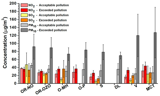 The average concentration of PM10 in the period of acceptable pollution was 32.7 ± 13.0 μg/m3 (Figure 2). It increased 2.8 times during the period of exceeded pollution 92.8 ± 37.8 μg/m3. The highest average concentration of PM10 during the period of exceeded pollution was determined in MCT (127 ± 64.4 μg/m3) and the lowest in DL (69.9 ± 8.6 μg/m3). Average concentrations of NO2 and SO2 for MSR were during the period of exceeded pollution 1.3 times and 1.5 times higher than in the period of acceptable pollution. Average concentrations of monitored pollutants (NO2, SO2, and PM10) in 2018 for individual localities are illustrated in Figure 3. The locality OR-NO has the values for the period of acceptable pollution higher than other localities. This sampling site is situated in the immediate vicinity of the largest pollution source at the territory of Ostrava, namely the metallurgical enterprise Arcelor Mittal (now Liberty Ostrava). Moreover, it is situated at the morphologically elevated position. The locality OR-NO is situated in the NE direction from the sintering plant that represents the main pollution sources. This direction corresponds to the prevailing air mass flow during sampling period.