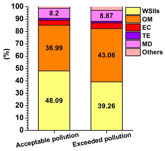 Average composition percentages of PM10 during the period of acceptable and exceeded pollution. Explanations: Water soluble inorganic ions (WSIIs), organic matter (OM), elemental carbon (EC), trace elements (TE), mineral dust (MD).