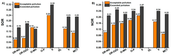 (A) Average values of sulphur oxidation ratio (SOR) and (B) nitrogen oxidation ratio (NOR) for acceptable pollution and exceeded pollution.