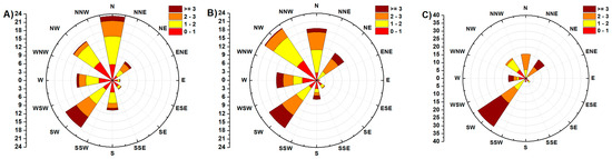 The wind rose for O-P: (A) years 2012–2018; (B) year 2018 and (C) December 2017–February 2018.