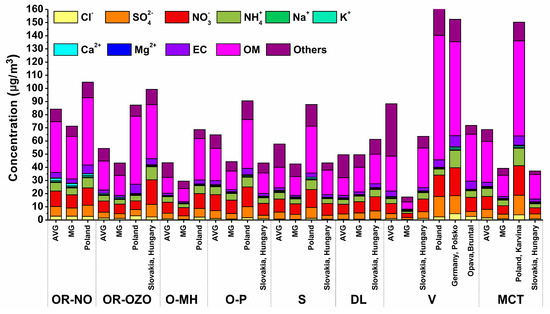 The average pollutant content in PM10 implies that during the period of exceeded pollution, the content of organic substances 43.1 ± 12% is higher by about 7%, which is compensated by the loss of water-soluble ions (Figure 4). Increased OM shares of PM10 during smog situations have also been observed in Switzerland [32].
