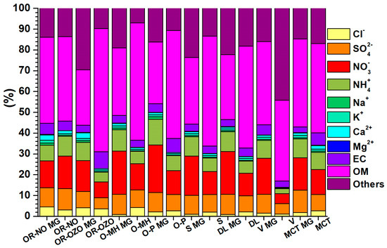 The minimal and maximal average percentage of organic matter in dust particles and water-soluble ions during the period of acceptable pollution (OM: 29.4–48.6% and IA: 53.3–66.8%) and exceeded pollution (OM: 37.3–44.7% and IA: 45.3–55.6%) is almost comparable. The average percentage of PM10 is shown in Figure 4. The percentage of inorganic particles (minerals and amorphous particles = mineral dust, MD) was derived by calculation according to Equation (1) by Amato et al. [31]: