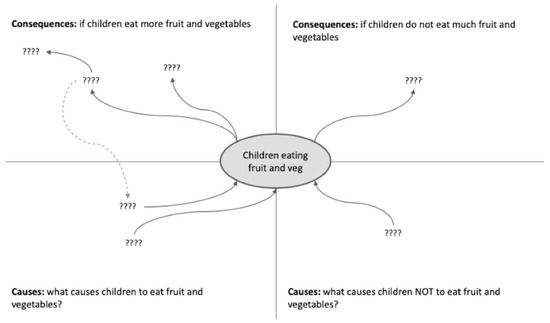 Cognitive mapping [21,22] is a visual tool that teases out participants’ understanding of the causes of an issue, exploring their causal reasoning. Cognitive mapping also elicits an understanding of why the issue is important to them by mapping out their perspectives of the consequences of addressing the issue, successfully or not. A template was provided (Figure 2) that participants completed.