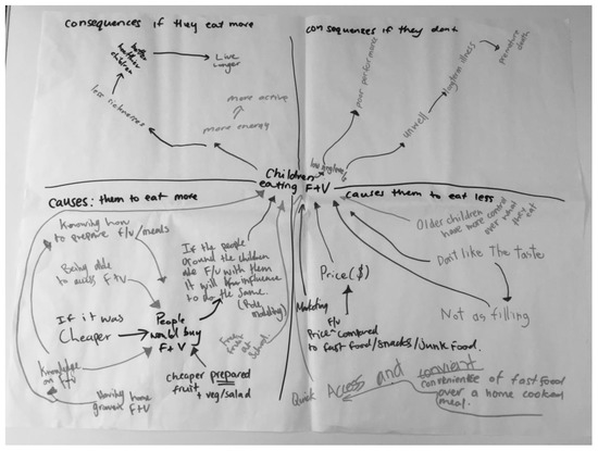 For the second activity, cognitive mapping, participants completed the causes and consequences template (Figure 2). In the “causes” boxes, they provided the key factors and causal relationships that they believed were affecting the consumption of fruit and vegetables by children (Figure 4). The “consequences” boxes provided information on why they saw the consumption of fruit and vegetable by children as important (Figure 4). The consequences listed were later used to focus the interventions and provide motivation for work beyond the completion of the workshops. Four of these templates were completed in workshop one. Discussions within and between groups allowed participants to share ideas and extend their maps, increasing awareness of the multiple causes and consequences. Thorough this process, participants developed a shared understanding of the complex nature of the food and nutrition environment, to the point where they could describe it in their own words.