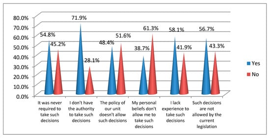 | Termination of life-saving medication (e.g., cardiotonic medication) | 25.5% (12) | 6.4% (3) | 68.1% (32) |