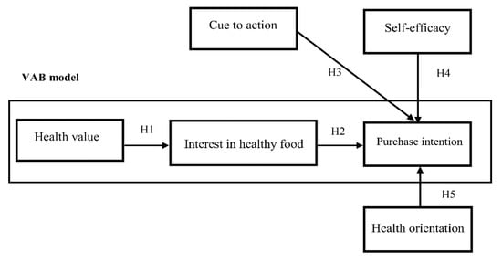 According to the VAB model, value affects behavior intention through attitude. In this study, the discussion of the relationship between consumers’ health value, interest in healthy food, and purchase intention focuses on three constructs: cue to action, self-efficacy, and health orientation. The proposed theoretical framework is shown in Figure 1, and the five hypotheses are below.