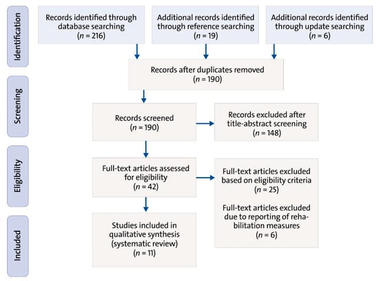 The database search yielded 216 titles (Figure 1). Through reference searching, 19 additional studies were identified. Through update searching, six additional studies were found. After the removal of duplicates, 190 titles remained. Of these, 148 studies were excluded after the title and abstract screening, as they did not fulfill the predefined eligibility criteria. Of the remaining 42 studies that were subjected to the full-text screening, 25 did not meet the eligibility criteria. Six sources were excluded afterwards as they reported rehabilitation measures and not ergonomic interventions. The main reasons for exclusion from this review were a different study topic (e.g., interventions related to the rehabilitation, prevalence and non-occupational risk factors of MSDs), study population (e.g., other occupational groups) or study design (e.g., a review, or descriptive cross-sectional study). In the end, 11 studies were considered suitable to be included in this literature review. They consisted of two randomized controlled trials (RCTs), six intervention studies, two evaluation studies and one cohort study.