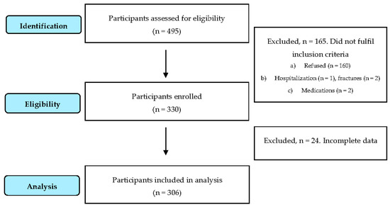 The sample consisted of 306 college students aged 19–25 years (mean age ± SD: 20.7 ± 1.4 years; 60% males) who were selected from different schools in the city of Seville using a stratified cluster sampling method. From the 67 degrees at the University of Seville, a total of nine were surveyed based on their urbanization area. Participants were excluded if (a) they refused to participate in the study; (b) had any health problem that temporarily or permanently prevented participation in physical activity; (c) used any type of medication that could induce changes in the study variables (e.g., opioids or antidepressants). A total of 495 students were initially identified, 160 refused to participate, and five students were excluded for health problems (n = 3) or the use of substances (i.e., cannabis) that could induce changes in the study variables. A flow diagram of the study participants is depicted in Figure 1. The study protocol was approved by an ethical committee (0319-N-19).