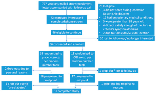 We proposed to enroll 60 Gulf War veterans aged 42–65 years who were suffering from GWI, as defined according to the Kansas Case Definition, for participation. This proposed sample size of 60 (30 CGJ and 30 placebo) was selected so that we would have 80% power to detect a 20% change in our endpoint efficacy outcomes and 92.6% statistical power to detect a 25% change. The Kansas Case Definition for GWI identifies 6 symptom domains (skin, pain, respiratory, neuro/cognitive/mood, gastrointestinal, fatigue) and requires endorsement of moderately severe and/or multiple symptoms in at least 3 of those domains. To meet the case definition, veterans also had to indicate that each symptom first became problematic during or after their Gulf War deployment (August 1990–July 1991) and not have any current medical conditions that may explain their symptoms (diabetes, cancer, among others specified) [12].