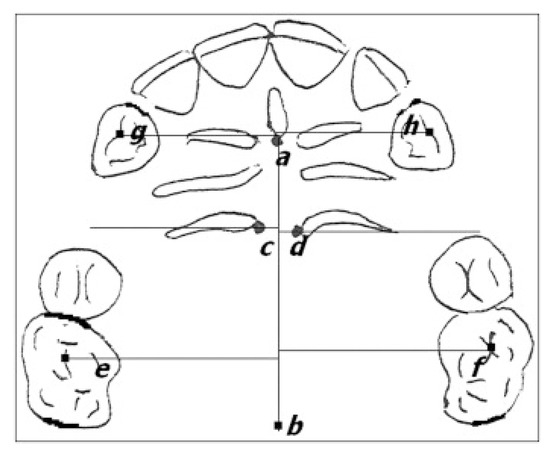 To measure the position of the canines and molars, the following landmarks and anatomical structures on the plaster casts were considered (Figure 3):
