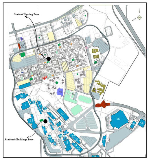 King Fahd University of Petroleum and Minerals (KFUPM) is located in Dhahran, a city on the eastern coast of Saudi Arabia, which is home to around 10,000 aspiring students. High temperatures and high humidity levels characterize Dhahran’s climate during the summer—which can reach 46 °C (114.8 °F)—while moderate weather characterizes the rest of the year [35]. It should be mentioned that KFUPM provides subsidized dorms for all students; thus, most of the students live on campus. The map of the study area is shown in Figure 1. The student housing zone (gray building) is located on the north side of the campus, and academic buildings (blue buildings) are located on the west and south side of the campus.