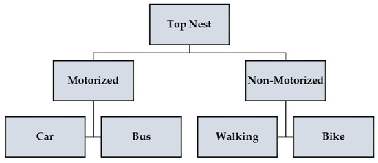 Students’ mode choice was predicted using a series of ANN models, depicted in Figure 1. For this approach, the final mode choice is determined in two steps; the ANN (top nest) was to predict the type of mode (motorized and non-motorized), while the actual mode choice was predicted in the last step, with another ANN, depending on the category of mode (motorized or non-motorized) the traveler selected in the first step. Therefore, each classification of mode choice is referred to as a nest.Since the final mode choice is an outcome of two ANNs, it is referred to as an ensemble. The same is illustrated in Figure 1, wherein the top nest of the ensemble predicts the choice of students for the motorized or non-motorized mode of transport. The former nest includes car and bus, while the latter includes walking and bike. This segregation was performed on the basis that walking and bike riding are considered active modes of transportation while others involve a motorized vehicle. The second layer of the ensemble predicts the final choice of the students. This approach provides a more detailed description of the travelers’ choice and their behavior by dividing it into two steps: motorized and non-motorized layers, as shown in Figure 2.