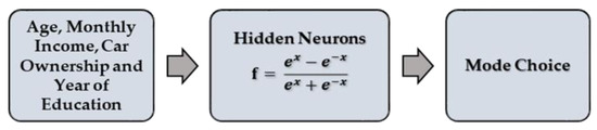 Based on the descriptive statistics of the valid questionnaires, it was found that 48% of students were currently commuting by bus, 13% by car, 13% by bicycle, and the rest (26%) via walking. Moreover, the college level split was noted as follows: 17% of the respondents were in their orientation year, 49% were freshmen, 16% were sophomores, 6% were juniors, 9% were seniors, and the remaining 3% were graduate students. Furthermore, the respondents’ ages ranged from 17 to 29 years of age, with an average respondent age of 20.2 years and a standard deviation of 1.6 years. Respondents’ average monthly income was found to be SAR 1400 ($374), with a standard deviation of SAR 800 ($213). Finally, 69% of the respondents owned an automobile. Information regarding the 229 valid response samples is summed up in Table A1 in Appendix A. An artificial neural network (ANN) was used in this study because it does not have restrictions of statistical significance or the requirement of knowing the exact relationships between input and output variables. It would have been challenging to use traditional statistical models (such as logit and probit, among others) on these data with a small number of variables because of these restrictions.