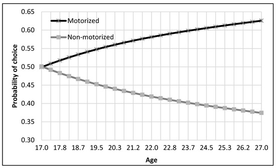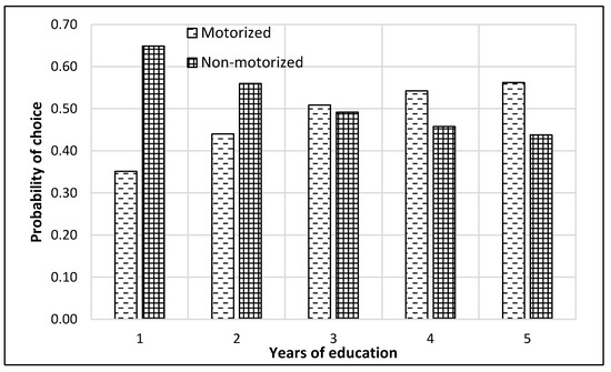 Figure 8 illustrates that the probability of selecting a non-motorized mode of transport decreased for senior students and especially graduate students. It should be noted at this point that many of these graduate students either had a job or were on-scholarship; therefore, they would find it easier to own and maintain a car. It is consistent with the observations from Figure 5.