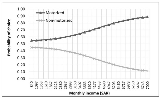 Figure 6 and Figure 7 reveal that a general preference existed for motorized modes by the students, regardless of car ownership or income. The preference for motorized modes could be due to the hot weather conditions in Saudi Arabia, which remain as such throughout the day during most times of the year. However, it could be seen that the probability of motorized travel further increased with car ownership and an increase in income.