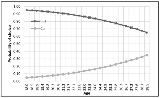 The sensitivity analyses of the ANNs developed to predict the choice of students among motorized modes of transport (bus and car) are presented in Figure 9, Figure 10, Figure 11 and Figure 12. It could be commonly observed from these figures that the use of the bus was generally preferred in most of the cases. Contributing factors for this phenomenon could be shorter trips, the available frequency of buses, and avoiding the search for parking spaces. However, age negatively impacted the probability of bus use, as shown in Figure 9. On the other hand, car ownership positively influenced car use probability, as presented in Figure 10.