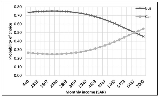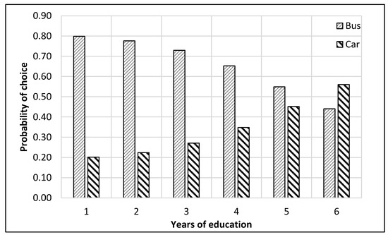 The probability of choosing the car mode was found to be higher than that for the bus for students with higher income levels and in their sixth year of education (see Figure 11 and Figure 12). The possible explanations for this trend could be that graduate classes were held in the evening, at which time the buses did not operate, and parking spaces were mostly empty. Second, some of these students using motorized modes could have been working outside (also indicated by their higher income). Thus, they might have been coming directly from their workplaces. In this case, the optimum income level was SAR 6500 ($1733), at or above which the students shifted from bus to car, as depicted in Figure 11.