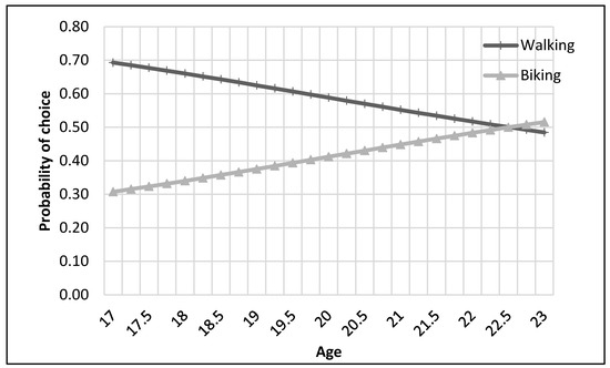 A second nest ANN was developed to predict the mode choice of students among non-motorized modes (i.e., walking and bike). The sensitivity analysis for this model is displayed in Figure 13, Figure 14, Figure 15 and Figure 16. Students who opted for non-motorized modes generally preferred walking over biking, as illustrated in the figures. Figure 13 reveals that students had an equal liking for biking and walking at 22 years of age, while the probability of biking was higher for older students.