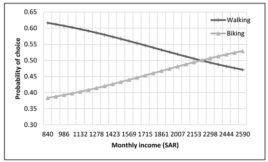 Car ownership did not appear to significantly impact the choice among non-motorized modes, as presented in Figure 14. Figure 15 reveals that students with an income of approximately SAR 2100 ($560) had an approximately equal probability of choosing biking and walking, while students who had an income higher than that tended to have a higher preference for biking. The range of students’ income showed in Figure 15 is lower than the range of the students’ income showed in Figure 7, as it is only for non-motorized modes, which would not be preferred by students with higher income levels. Graduate students who chose non-motorized modes had an approximately equal proportion of selecting walking and biking, as displayed in Figure 16.