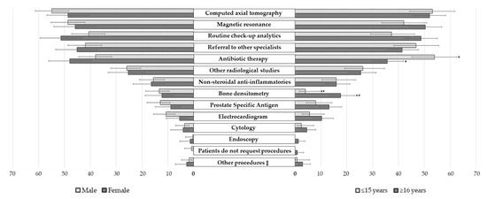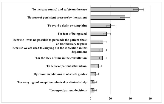 In relation to the type of requests made by patients, the results are consistent with previous studies, in which diagnostic tests are the most demanded [4,30], giving rise to unnecessary CT or MRI scans [31]. In the United States, 37% of patients in primary care consultations requested unnecessary diagnostic procedures, while 97% of doctors working in the emergency department indicated, at least once, an unnecessary CT scan or MRI. Diagnostic imaging tests also constitute 32% of the diagnostic procedures recently investigated in the field of health care overuse. The profile of the patient requesting unnecessary procedures corresponds to a woman aged 51–65 years, similar to that obtained by a study that characterized the overuse of radiological tests [32], and with a disease not yet identified, a profile similar to that described in primary care [24].