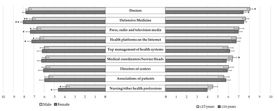 Degree of responsibility regarding overuse referred, according to the professional’s gender and work experience. Scale from 0 to 10, where 0 means “No responsibility” and 10 “Maximum responsibility” (with the expected 95% confidence interval of such percentages). * p < 0.050; ** p < 0.001.