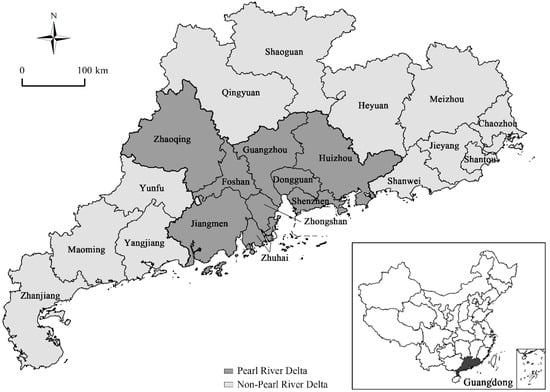 Located in southeastern China, Guangdong Province has experienced unprecedented economic growth and has become the most developed province in China, with the gross domestic product of 8555.57 billion yuan in 2016, because of the reform and opening-up policies. Additionally, it is China’s most populous province, with a resident population that reached 109.99 million in 2016, up from 61.04 million in 1990, and has a land area of 179.7 thousand square km. Economic development and population growth in this region followed a core-periphery gradient, with the core Pearl River Delta (PRD) as the developed region and the peripheral Non-Pearl River Delta (NPRD) as the developing region, as shown in Figure 1 []. Moreover, this regional difference in Guangdong Province mirrors that of the eastern, central, and western regions of China. Rapid development of pollution-intensive industries in Guangdong, which has become “the factory of the world,” badly damaged the environment. Foreign investment in China has greatly increased since the l990s, aggravating the environmental degradation. However, the current environmental quality is greatly improved, due to the implementation of strict environmental measures, such as green development, making Guangdong the benchmark for other provinces regarding environmental efficiency []. Guangdong’s development path is the epitome of the “growth first, cleaning up later” philosophy of China []. Undoubtedly, Guangdong Province is highly representative of China as a whole, in terms of regional differences and environmental management, especially in the context of globalization, and its environmental governance process since 1990 deserves more attention.