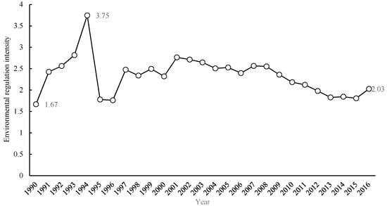To identify the general trend of environmental regulation intensity in Guangdong Province, this study computed the environmental regulation intensity for 21 cities from 1990 to 2016. It used the full sample of cities to calculate the annual means for Guangdong Province, as shown in Figure 2. The statistics show that environmental regulation intensity in Guangdong has consistently increased from 1.67 to 2.03 over the past 27 years, and can be divided into two phases. During the first phase, from 1990 to 2000, environmental regulation intensity changed frequently, meaning that pollution emissions heavily contaminated the environment, and city governments enforced additional stricter environmental policies for several years. The environmental regulation intensity increased rapidly from 1990 to 1994, and reached the peak of 3.75 in 1994. This was because a series of environmental policies were implemented to strengthen environmental governance. Notably, China’s Agenda 21 was finished in 1993, and was put into effect to pursue sustainable development in 1994. The progress of the control project as a part of the annual environmental protection plan, which was listed in the China Economic and Society Development Plan for the first time in 1994, was remarkable. This national policy event may have had a direct but short-lived impact on local environmental regulation, leading to stronger but temporary environmental regulation in Guangdong in the 90s. However, the facts showed that the impact of the policy was subject to the goal of economic growth, which was overriding. Even so, during the second phase after 2000, environmental regulation intensity was reduced slightly but remained stable, indicating that the end-of-pipe control of environmental pollution was effective and environmental pollution levels were relaxing in Guangdong. In 2012, the construction of ecological civilization was proposed, aimed toward the coordination of the ecological environment and economic development in China, similar to the cooperation between municipalities and national parks in Poland, one of the European countries of the former Eastern Bloc []. Additionally, more attention was paid to pollution prevention and ecological protection, which played a positive role in promoting sustainable development. The positive effects of environmental governance in China contrast with the impact of government intervention on agricultural development in Poland [].