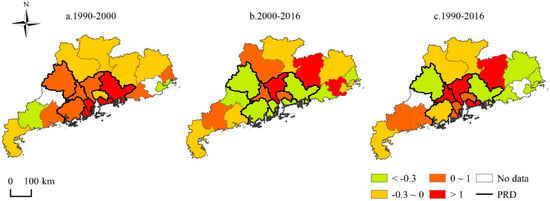 Changing environmental regulation intensity in the different periods, 1990–2000, 2000–2016, and 1990–2016, can be broken down and further compared (Figure 3). From 1990 to 2016, the values of environmental regulation intensity of seven cities (corresponding to 33.3% of all cities) decreased by 0.3, which indicates that most cities’ environmental regulations have increased in intensity in Guangdong Province over the past 27 years. Additionally, the environmental regulation intensity of four cities showed an increase of over 1, focused in the PRD region. Between 1990 and 2000, the environmental regulation intensity of most cities increased; only eight cities loosened their environmental management. However, only seven cities increased their environmental regulation intensity from 2000 to 2016. As a whole, the increase of cities’ environmental regulation intensity over the past 27 years mainly occurred during the first phase, before 2000.