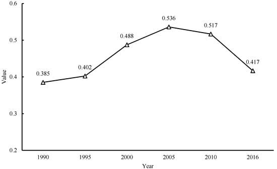Geographical analysis showed that cities’ environmental regulation intensity was distributed unevenly across Guangdong Province. The Gini coefficients of environmental regulation intensity in Guangdong Province were calculated in the selected years from 1990 to 2016 (Figure 4). The results show that the Gini coefficient increased during the period of 1990 to 2016, reaching the peak of 0.536 in 2005, and then decreased slightly to 0.417 by 2016. This indicates that the regional difference of environmental regulation intensity in Guangdong Province is significant and extremely sizable, although it has been narrowing since 2005.