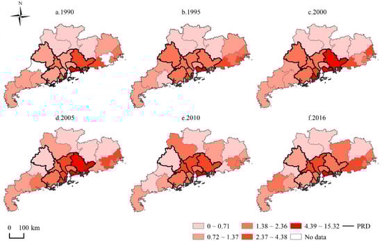 Each city’s environmental regulation intensity from 1990 to 2016 was classified into five levels, using the natural breaks method, as shown in Figure 5. The environmental regulation intensity of cities along the coast was higher than those in the inland area. Additionally, the environmental regulation intensity for most PRD cities was much higher than in the NPRD region, especially after 2000, which indicates that environmental governance in the PRD region was stricter than in the NPRD region. Additionally, as Figure 5 shows, the environmental regulation intensity of Guangzhou, Foshan, Heyuan, and Dongguan increased significantly from 1990 to 2016, especially for Guangzhou and Foshan, which increased from level 2 to level 4. In addition, Shenzhen’s environmental governance was ranked the highest among the cities in Guangdong Province, meaning it enforced the most rigorous environmental policies.