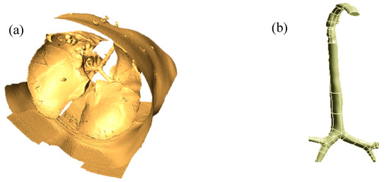 The airway model was reconstructed from DiCom images of CT-scan data. Medical images of one 55-year-old adult subject were used for the overall procedure, and different geometry generation software, AMIRA and Geomagic, were applied to image-processing. Details of the segmentation and reconstruction procedures can be found in the authors’ previous work [27]. Figure 1a shows a raw 3D model of the whole lung, and Figure 1b shows a processed digital replica of the upper and large bronchial airways considered in this study.