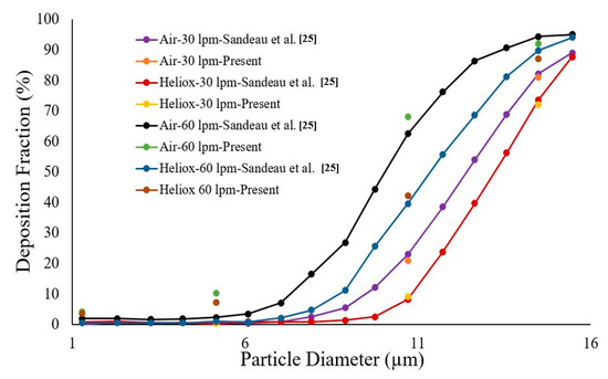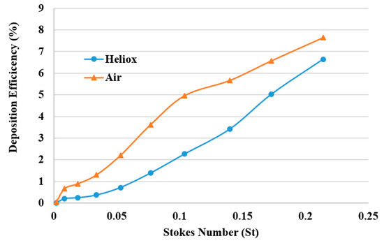 The DE was calculated against Stokes number St = ρdp2U/18µD for different breathing methods (Figure 14). The overall DE curve for both heliox and air-breathing shows an increasing trend with the Stokes number, which aligns with the general deposition pattern of the microparticle. The higher Stokes number shows higher DE, which indicates that microparticle inertia and inertial impaction influence the overall deposition pattern.