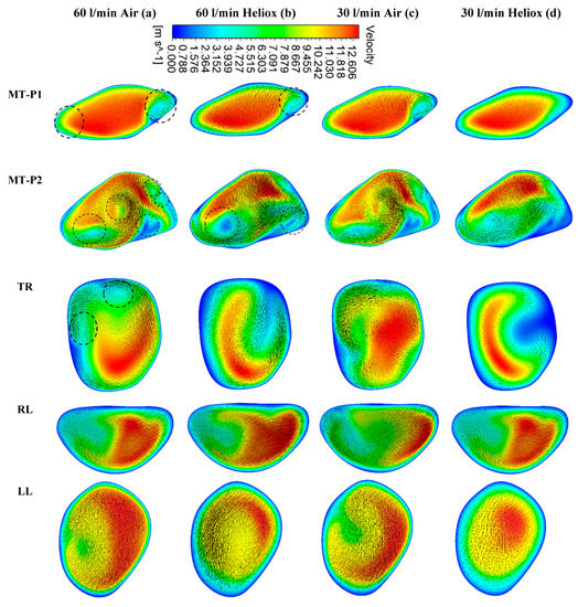 Figure 5 and Figure 6 present the simulated velocity contours at selected positions of the mouth–throat and bronchial airways at t = 1 s and t = 2 s, respectively. The study considered heliox and air-breathing. Figure 5a,b depicts the velocity contours at 60 L/min flow rate for air and heliox breathing. At t = 1 s, the velocity contours at the mouth–throat region (MT-P1 and MT-P2) show a more complex flow field for air-breathing than for helium–oxygen mixture breathing. At MT-P1, air-breathing resulted in two vortices, while the heliox breathing shows only one vortex solution. At MT-P2, the flow field for air inhalation shows a highly complex velocity pattern with a five vortex solution. On the contrary, the helium–oxygen mixture breathing shows a two-vortex solution. The velocity contour at the tracheal section also shows a similar flow field for air inhalation. The velocity vectors of the corresponding velocity contours illustrate the highly complex flow field at the mouth–throat and tracheal area. The overall velocity contour and velocity vector for 60 L/min flow rate illustrate that flow becomes locally complex at the oral airway for air inhalation. The highly dense air yields a more complex flow field than a heliox mixture. At 30 L/min flow rate, air inhalation also shows a similar flow field at the oral and tracheal wall as at 60 L/min flow rate. At t = 2 s, the velocity contour shows a similar vortex pattern as at t = 1 s for air and heliox breathing (Figure 6). However, at t = 2 s, the velocity magnitude at the selected position of the airways was found slightly higher than t = 1 s.
