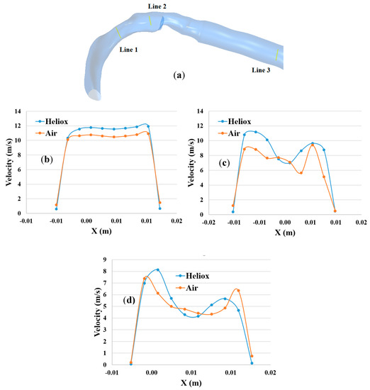 The overall velocity and velocity vector contours for air-breathing are found significantly other than in the case of heliox inhalation. The velocity contours for heliox breathing show a lower velocity near the airway wall, while air-breathing shows higher velocity near the airway wall. Velocity profiles were plotted at the selected positions of the mouth–throat and trachea for a better understanding of the airflow pattern. Figure 7 shows the velocity profiles for air and heliox at the 60 lpm case. Figure 7b shows the velocity profile at the beginning of the mouth–throat area, and the velocity magnitude at the middle of the mouth–throat wall is higher for heliox than the air-breathing. However, the near-wall velocity for air is found higher than the heliox. Figure 7c shows the velocity profile in the middle of the mouth–throat model (line 2), and the velocity profile shows an intricate flow pattern at this position. The velocity profile for air at line 2 is found more complex than the heliox. A similar velocity flow filed is observed in the tracheal region of the airway, which is shown in Figure 7d. The highly complex structure of the oral airways and high flow rates influence the flow pattern in the upper airways.