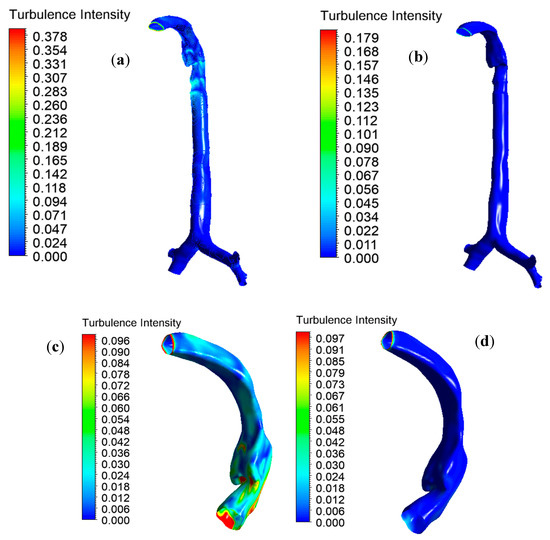 Turbulence intensity for different gas inhalation conditions at 60 L/min flow rate, (a) air inhalation upper airway, (b) heliox inhalation upper airway, (c) air inhalation mouth–throat region, and (d) heliox inhalation mouth–throat region.