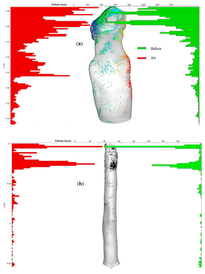 Figure 10a,b shows the polydisperse particle deposition patterns in the oral and upper airways at 60 L/min flow rate for air and heliox inhalation. In Figure 10b, it can be seen that a larger amount of particles are deposited at the mouth–throat area and large bronchial airways when breathing air, compared to breathing heliox in Figure 10a. The highly complex anatomical shape of the mouth–throat, higher pressure resistance, and turbulence intensity influence the deposition pattern when inhaling air.