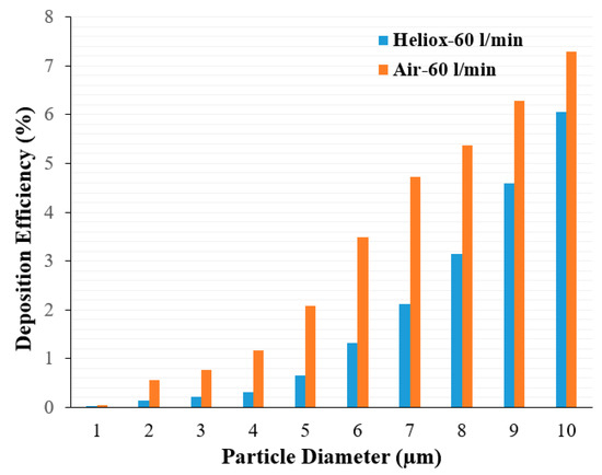Analysis of the polydisperse particle DE at the mouth–throat area provides further insight. Figure 12 shows DE for air and heliox inhalation at 60 L/min flow rate. DE is always higher for air inhalation and shows an increasing trend with particle size. For the microparticle, inertia plays an important role. At a higher inhalation rate, micro-diameter particles deviate from the air trajectory due to their higher inertia when the particle faces any irregular pathway. The mouth–throat shape is highly irregular, which influences turbulence intensity at 60 L/min flow rate. Air flow rate, turbulence intensity, complex irregular shape, and larger inertia all significantly increase DE at the mouth–throat area. For a heliox gas mixture, the flow becomes less turbulent due to a lesser gas density, which then decreases the overall DE at the mouth–throat area.