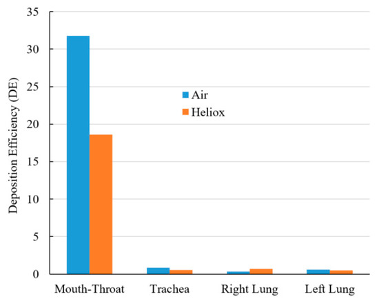 Figure 13 shows a DE comparison for air and heliox inhalation. The chart shows that particles are mostly trapped at the oral airways. For air-breathing, more than 31% of particles are deposited at the mouth–throat region, which is 1.71 times higher than the deposition rate for helium-oxygen gas inhalation. The numerical results demonstrate that the less dense heliox mixture significantly decreases aerosol particle deposition at the oral airways, which is the key finding of this study. As a result of the lower deposition rate in the oral airways, more particles will be transported towards the lungs. DE at the tracheal wall was also found lower for heliox breathing, essentially supporting the key finding of this study. While DE when inhaling heliox was found lower in the left lung, it was found higher in the right lung.