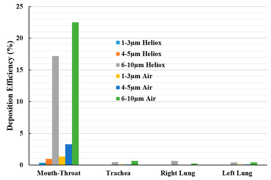 Figure 15 reports the deposition hot spot for different diameter particles during heliox and air inhalation. The DE calculations were carried out for three ranges of particle diameter. The overall investigation reports particles ranging from 6–10 µm diameter were mainly deposited at the mouth–throat area of the lung. The DE of smaller cluster particles (1–3 µm) at the mouth–throat and upper airways was found relatively low, and most of these particles are escaped through the outlets of the airways.