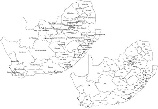 This study used secondary data collected as part of the South Africa Demographic and Health Survey in 2016 (SADHS 2016). The SADHS 2016’s adult health module recorded information that included, among others, the self-reported prevalence of two CVDs, stroke and heart attack, and the three risk factors of interest: raised blood pressure, raised cholesterol and smoking for both male and female adults aged 15 years and older. A total of 12,717 adults were targeted for this adult health module, but 10,336 responded. We used health districts for the spatial analysis in this study. Figure 1 shows the map of the 52 districts of South Africa and the number of the sampled adults, which ranged from 23 to 544 per district, with an average of 203 subjects. Due to the sample design, Central Karoo, which has a very sparse population was not sampled from and was not included in the analyses. For the purposes of our study, the data were stratified by gender (male and female) and age (15–39 years (young adults) and 40–64 years (adults)). A cut-off point of 40 years was used as it has been observed that the burden of CVDs increased significantly after the age of 40 years [,].