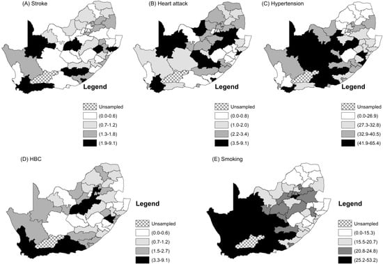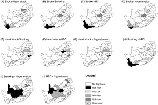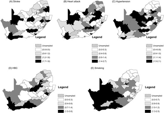 The data on high blood cholesterol, smoking, stroke and heart attack were self-reported. Newell et al. [] noted that inaccurate self-reporting could result in the overestimation or underestimation of the disease burden. Biomarkers can be used to redress the problem but, unfortunately, these were not available. Without supporting data for validation, the results of the present study need to be treated with caution. However, self-reported values and directly measured values tend to be highly correlated, even in the presence of bias [,,]. It is our conviction that, even in the presence of bias in the self-reported values, the spatial autocorrelation patterns obtained in this study would not change much when measured values were to be used. Our analyses were done at the district level, which is the level at which primary health is provided in South Africa. Aggregation of the results has the effect of introducing ecological fallacy and large geographical units of analysis may mask some information of interest []. Results and efficiency may be improved by having smaller units of analysis []. According to Paquet et al. [], when conducting spatial epidemiology, the administrative unit to use in the analysis goes beyond just the size of the unit of analysis and will need to be studied for each given setting. Our study excludes adults older than 64 years old. This was done to focus on the spatial patterns attributable to the productive age group of 15–64 years, which overlaps with the age range in which premature mortality occurs (less than 70 years). However, it is hereby acknowledged that this limits the ability to evaluate patterns in the age groups that are at the highest risk of cardiovascular disease (65 years and greater).