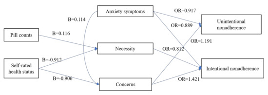 In conclusion, anxiety symptoms and concerns about medication were associated with unintentional non-adherence, and anxiety symptoms and beliefs about medication (concerns, necessity) were associated with intentional non-adherence. In addition, belief about medication (concerns, necessity) was associated with health status, pill counts, and anxiety symptoms (Figure 1).