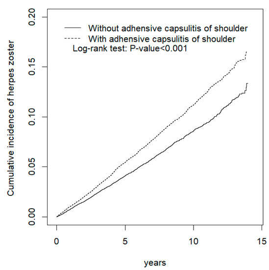 Ding et al. noted a higher Hospital Anxiety and Depression Scale among patients with ACoS relative to their controls. They reported a 28.2% prevalence of depression among patients with ACoS and claimed that depression coexists with ACoS [17]. However, contradictory results were reported by Toprak and Erden. They found no significant difference between the Beck Depression Inventory scores of patients with ACoS and controls [18]. On the basis of the Hamilton anxiety and depression questionnaire, Ebrahimzadeh et al. observed a 77% prevalence of depression among patients with ACoS. However, they also reported no definitive relationship between depression and range of motion of the shoulder among the patients with ACoS. They suggested that depression among patients with ACoS was due to the experience of increased limb pain and disability [19]. The results of the present study support this finding; we noted more patients with depression in the case group than in the control group after matching by age and index year (Table 1). Clinicians should pay attention to the exacerbation of HZ due to depression caused by ACoS-related pain.