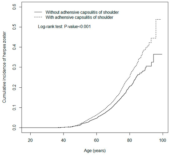 Cumulative incidence of herpes zoster for patients with (dashed line) or without (solid line) adhesive capsulitis of the shoulder versus index age. The unit of y axis (cumulative incidence) is %.