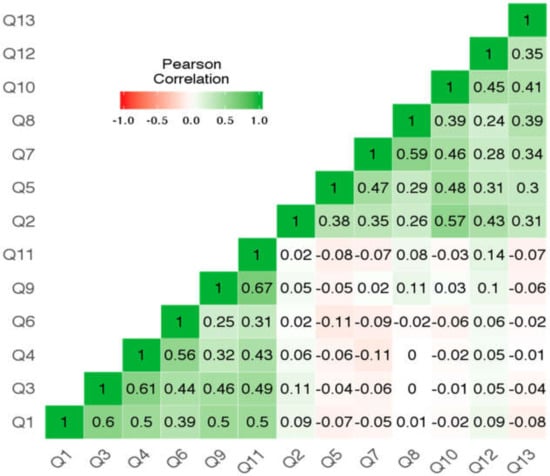 For the ego subscale the Cronbach’s alpha is 0.84 and the correlations item-rest are respectively: Q1—0.66, Q3—0.70, Q4—0.64, Q6—0.50, Q9—0.59, Q11—0.64. For the Task subscale the Cronbach’s alpha is 0.81 and the correlation item-rest are respectively: Q2—0.54, Q5—0.53, Q7—0.60, Q8—0.51, Q10—0.68, Q12—0.49, Q13—0.50. Reliability of the whole test and ego and task subscales based on McDonald’s omega was 0.77, 0.84, 0.82 respectively. Items are more highly correlated within their own subscales: for ego-green colour, lower left corner of Figure 1, for task-upper right corner of Figure 1). Correlations with items from another subscale are low–lower right corner of Figure 1.