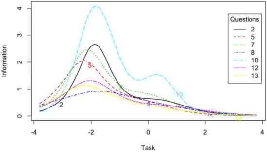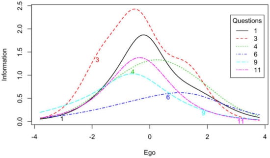We also evaluated the reliability of particular items based on the results obtained in the items response theory (IRT) analysis using generalized partial credit model (GPCM) scaling. The obtained results of precision values of particular positions estimated on the basis of the results of the informative function are presented in Table 1 and Figure 2 and Figure 3. In the ego subscale, items generally provided more information in middle values of trait than the high and low values of traits. The least information provided item 6 (Figure 2). On the other hand, in the case of the task subscale, items contained more information for a low-level trait than a high-level trait. The less information than other items provided items 8, 12, and 13 (Figure 3).